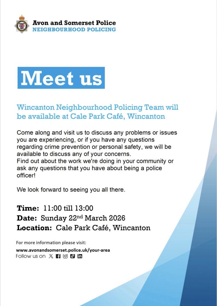 Wincanton Neighbourhood Policing Team Meet Up, Sunday 22nd March 2026by Lisa Gilby Please note the venue is the River Cale Cafe in Wincanton Screenshot